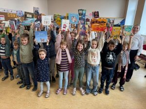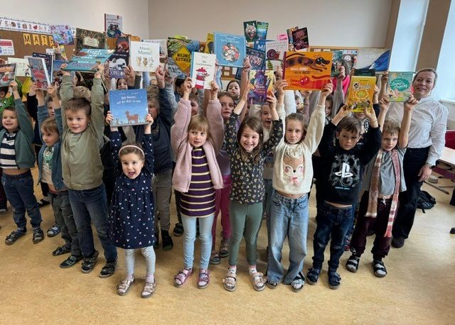 Kinder und Lehrerteam freuen sich riesig über die neuen Leseschätze und sagen: Ein herzliches Dankeschön!